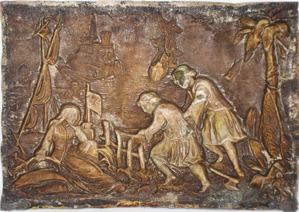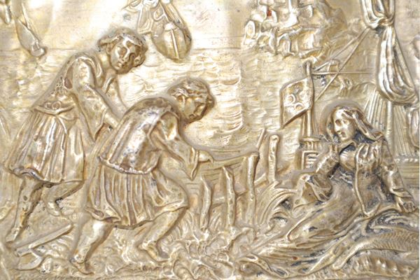 Vermeille embossed silver plate depicting a sailing ship with characters, late 18th century