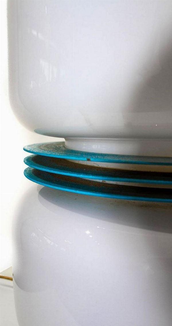 Stilux, table lamp in glass and light blue lacquered metal from the 1960s. H 30 cm, diameter 30 cm. Signs of use