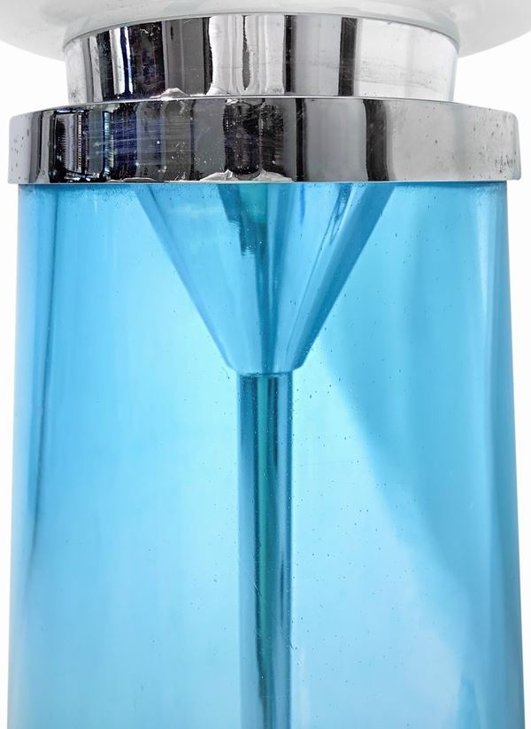 Structure in chromed metal, body in transparent glass with a truncated cone shape in shades of blue, diffuser in white cased glass, counter-diffuser in satin glass