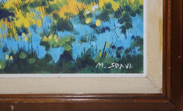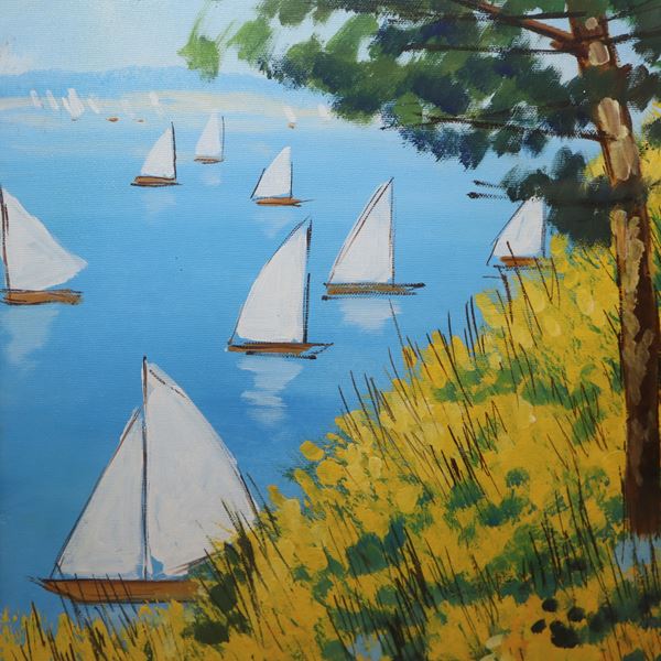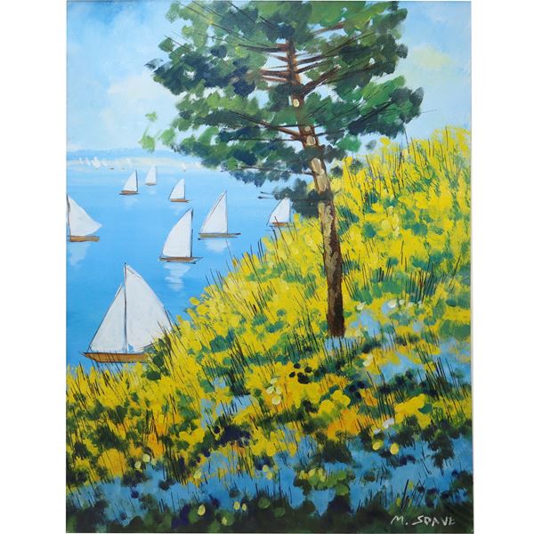 Signed lower right and Soave on the back. Depicting seascape with flowers and sailboats