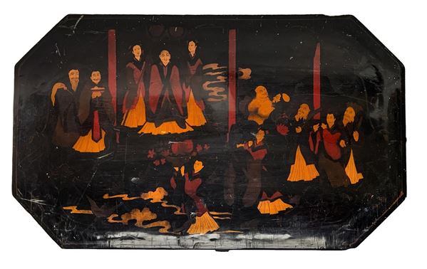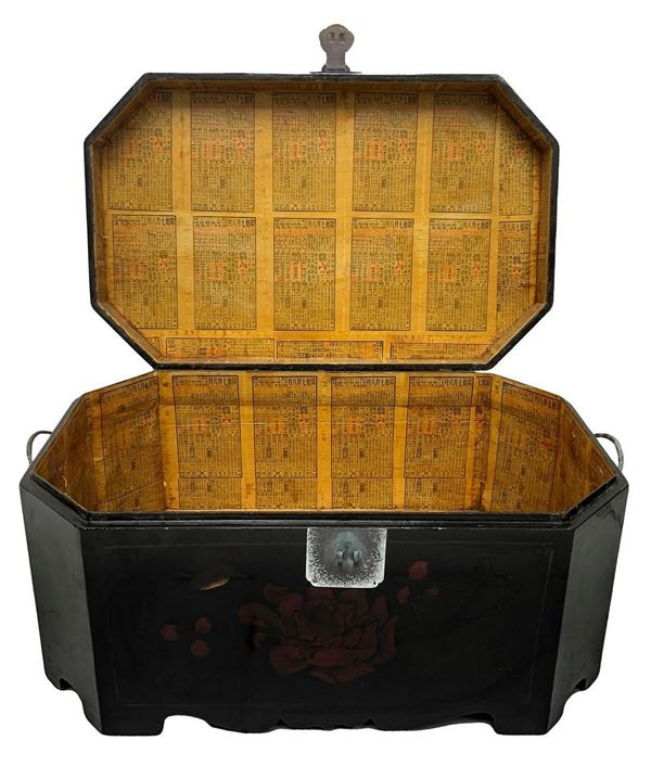 Ancient Chinese travel trunk in lacquered wood hand painted on the front with floral decorations