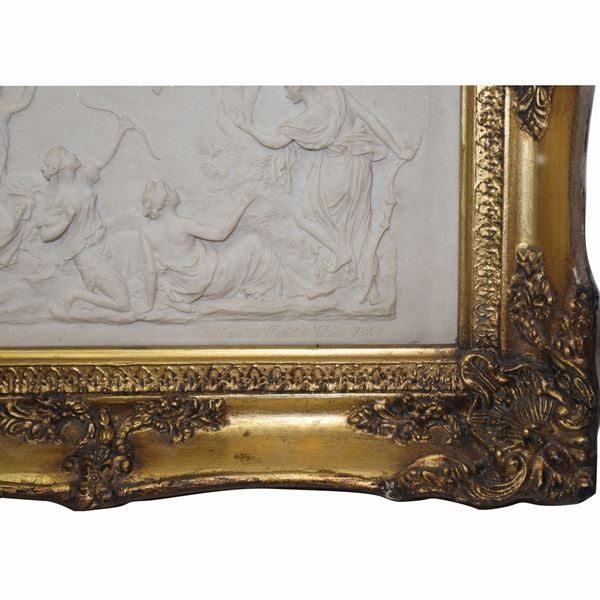 Bas-relief depicting a hunting scene, Diana and the nymphs in a gilded frame