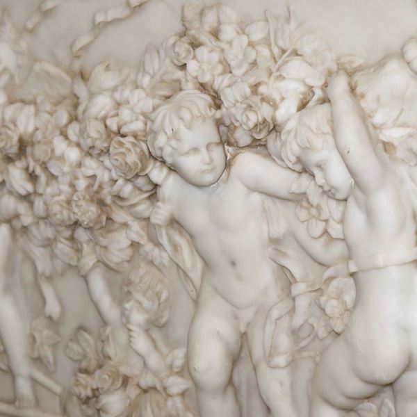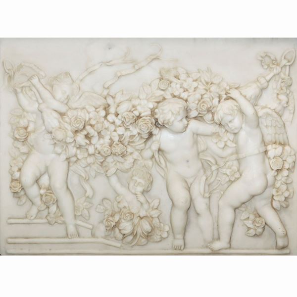 Bas-relief depicting cherubs playing with flowers in a gilded frame