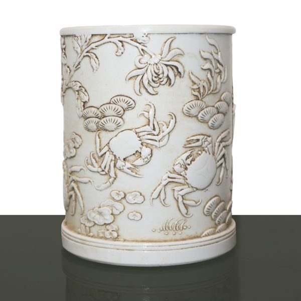 Brush holder carved with depictions of crabs, shells and flowers, Bitong 19th century