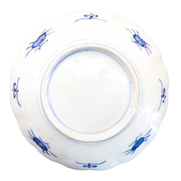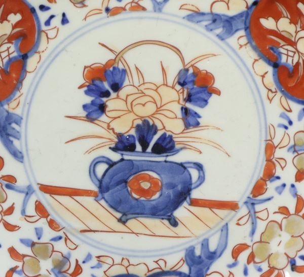 With floral representations in shades of orange and blue on a white background, on the back painted at the edges; minimal chipping to the edge.