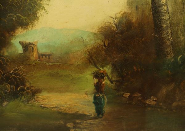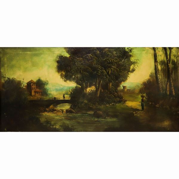 Landscape with bridge over river, trees and characters, Painter of the early 20th century.