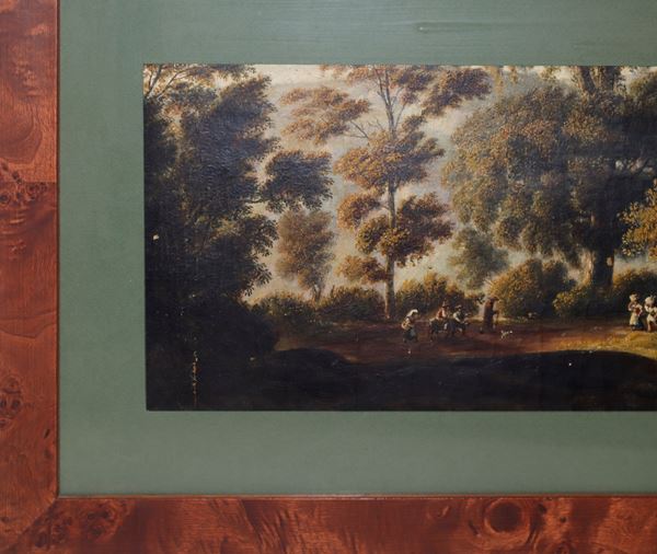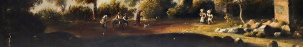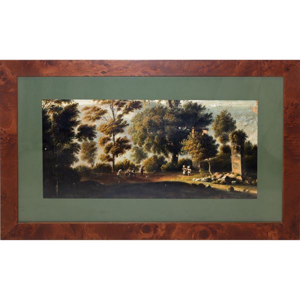 Landscape with trees, ruins and peasants, 19th century painter