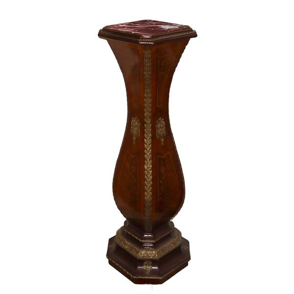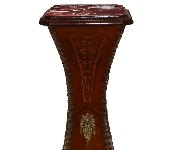In rosewood, base in mahogany, top in red Verona marble, bronze spikes applied to the four corners, floral inlays in light woods