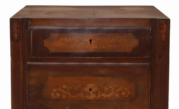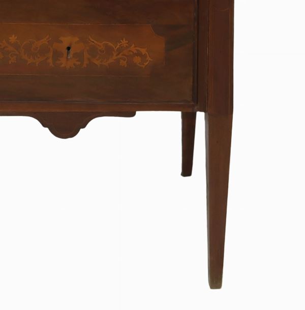 Three drawers, truncated pyramid feet, light wood inlays on the top, sides and drawers