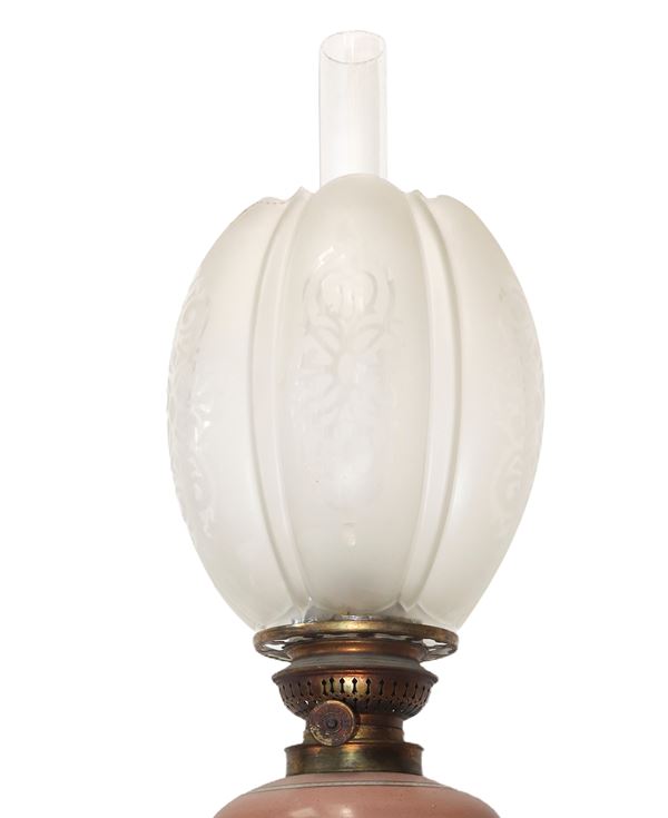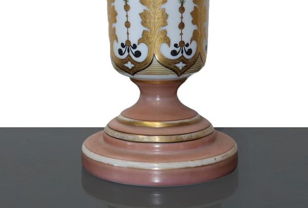 Painted with polychrome and gilded enamels in the center on a white base. Satin glass diffuser