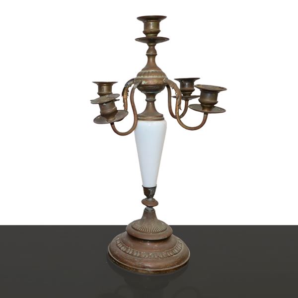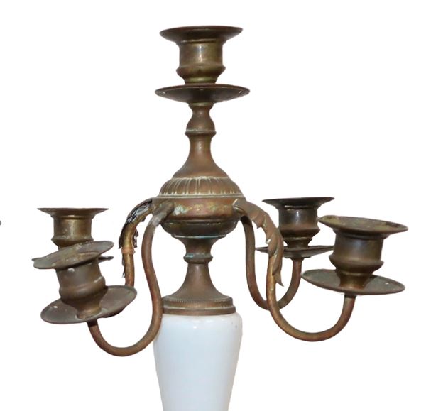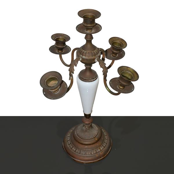 Pair of 5-light candlesticks in patinated bronze metal and stem in white porcelain