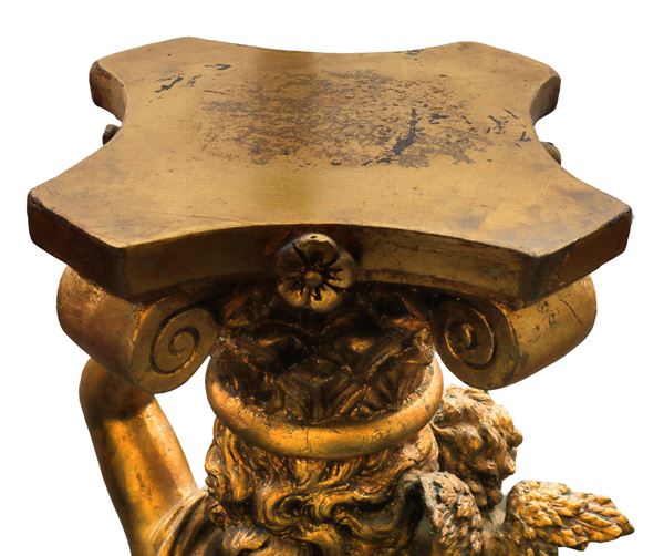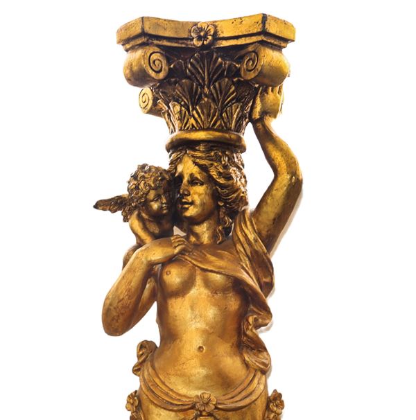 cm H 117 base cm 40 x 40 baroque style in the shape of caryatids with cupid, base decorations in relief depicting acanthus leaves