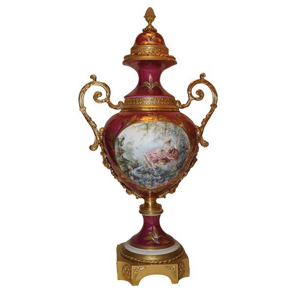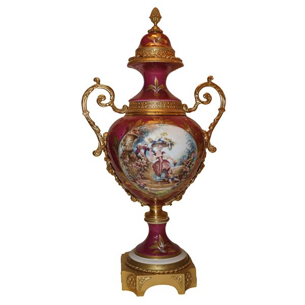 Base handles and details in gilded metal, on the front polychrome paintings of gallant genre, on the back depiction of leaf