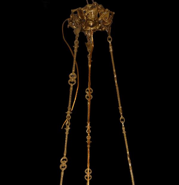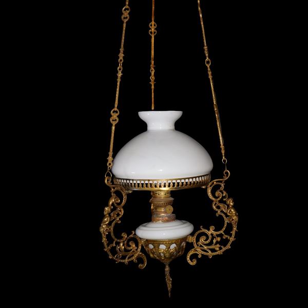 Petroleum pendant lamp in metal and white opaline., Late 19th century