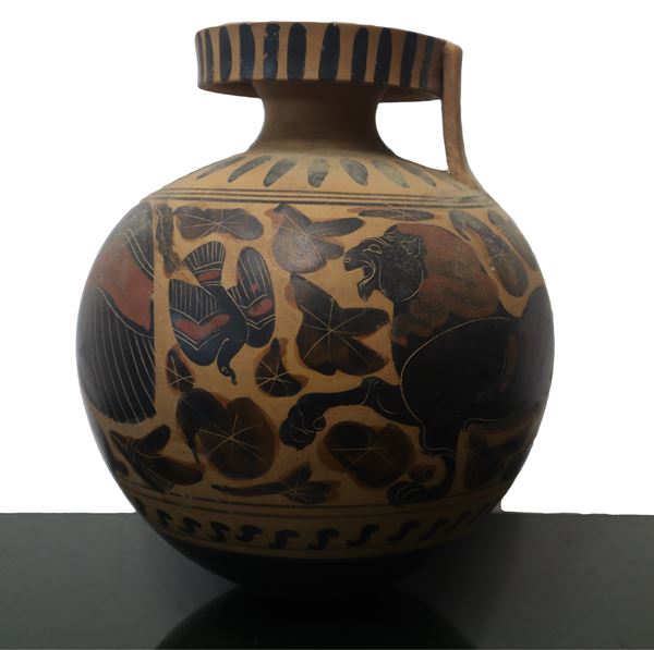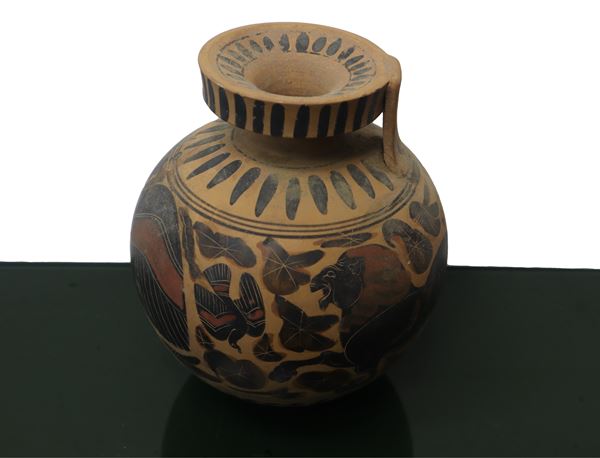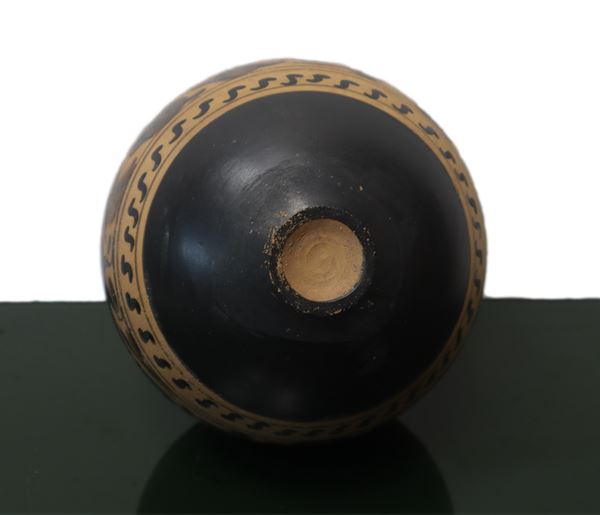 Archaeological reproduction,Globular vase with narrow neck handle and wide flat neck. Anza at the hem and shoulder. Mythological depictions. Marketable fair opinion Superintendence for cultural and environmental heritage of Catania of 12/13/22 Protocol No. 19871