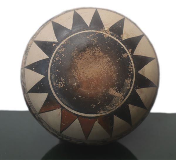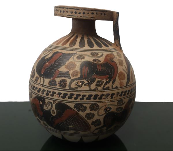 Archaeological reproduction, Globular vase with narrow neck handle and wide flat neck. Anza at the hem and shoulder. Mythological depictions. < font color="#000000">Tradeable correct opinion Superintendency for cultural and environmental heritage of Catania dated 12/13/22 Protocol No. 19871