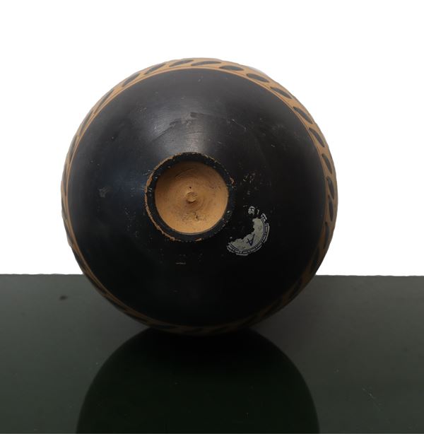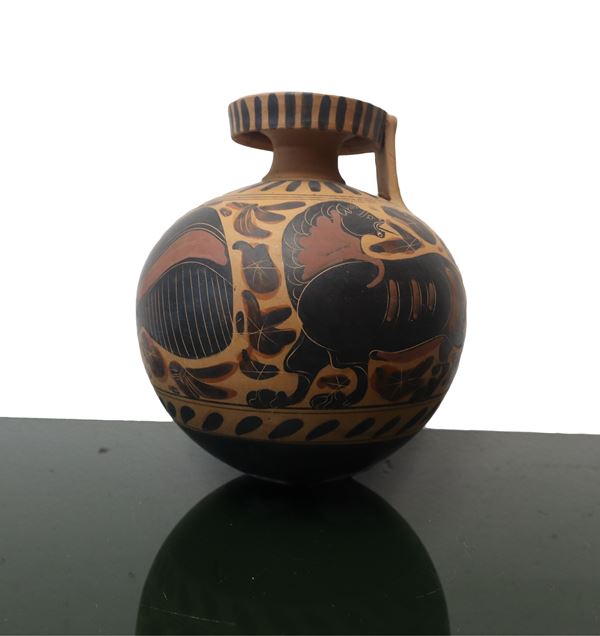 Archaeological reproduction, Globular vase with narrow neck handle and wide flat neck. Anza at the hem and shoulder. Mythological depictions. < font color="#000000">Marketable fair opinion Soprintendenza for the cultural and environmental heritage of Catania of 12/13/22 Protocol No. 19871