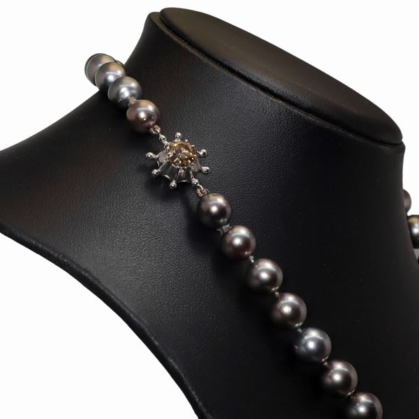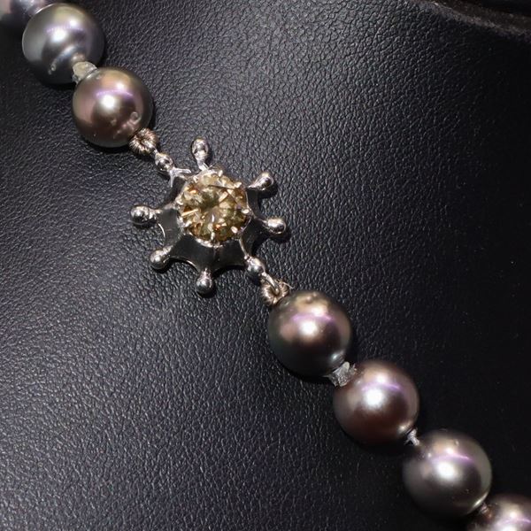 Necklace with pearls degrading 12/18 and susta in 18Kt white gold with central Francy Cognac diamond approx. 1.50 Kt