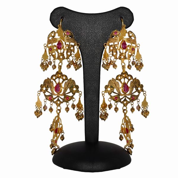 Pendant earrings in low title gold with garnets