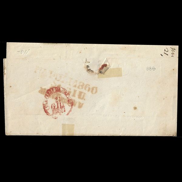 1860. Letter from Naples to Nicotera dated 21 June 1860, bearing a lilac pink 2 grana stamp of the Kingdom of Naples (Sass. N. 5a). The letter bears the Canceled in folder stamp and the accessory S.F. stamp. in blue. Buonocore Cert.