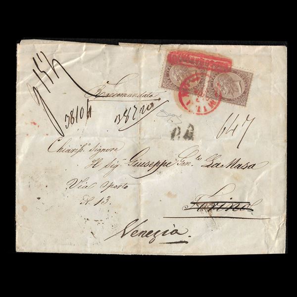 1863. Letter from Milan to Turin, redirected to Venice, franked with a vertical pair of c.30. brown, London edition (Sassone L19) with the rare "Milano rosso" (P9) and "recommended in folder" red (P12) cancellations. Raybaudi gold certificate.