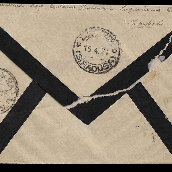 1921. Second port letter from Tripoli to Lentini dated 04.14.1921 franked with 10 Leoni pink c. and four 25 c. Michetti light blue with black overprint of the first type "Libia" (Sassone n. 4 x2 + 7x4. Cert. Zappalà