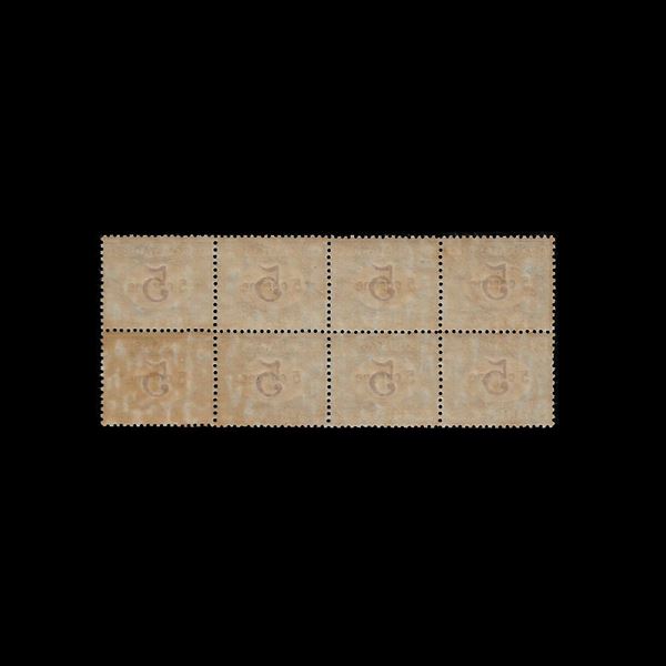 1922. 5 C. on 5 l. light blue and carmine, Italian tax postmarks of 1890/903 overprinted (Sass. N. 4). Horizontal block of otto.MNH.