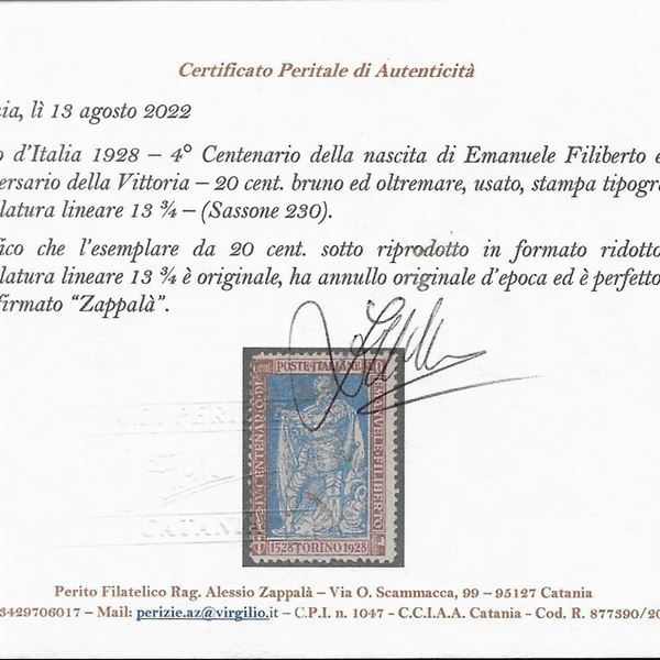 1928. 20 c. brown and overseas - 4th centenary of the birth of Em. Fil. And 10th anniversary Vittoria - used, linear perforation 13 3/4. Zappalà Cert