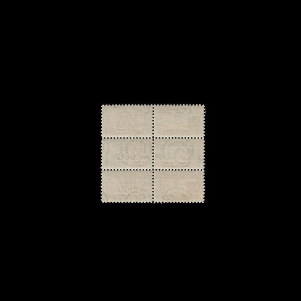 1954. 1000 l. overprinted parcel post stamp (Sassone n. 26). Vertical block of three well centered.