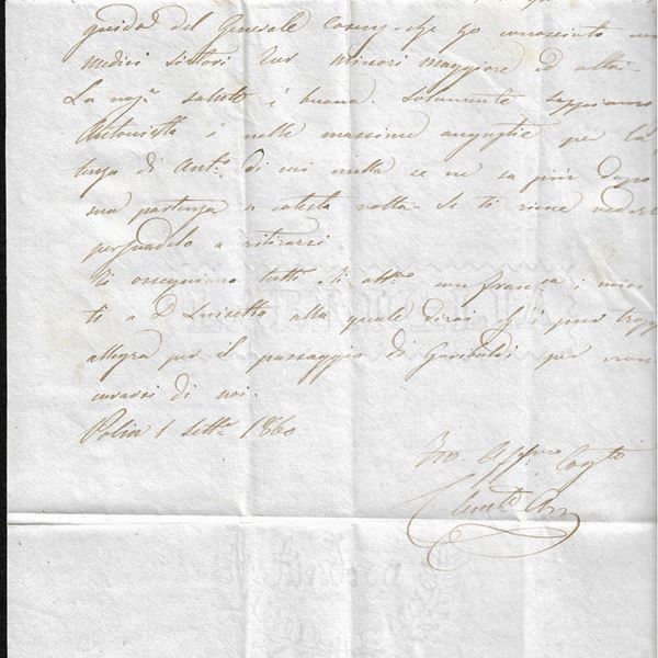 The letter is trimmed at the top , with a slight loss of head which does not however compromise its understanding, and is missing a rectangular piece on the reverse where no writing was present. We note a small conservative restoration in the central part of the first sheet; the black wax seal and the postmark of Nicastro are present, dated 5 September 1860