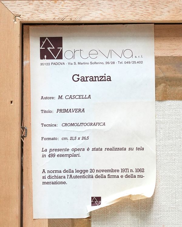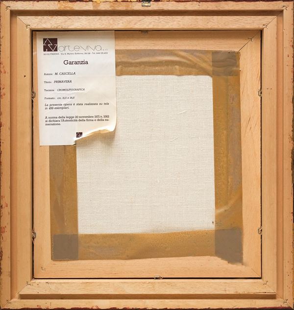 Signature on the front bottom left. On the back, Arteviva S.r.l. warranty certificate. Padua. Work created on canvas in 499 copies