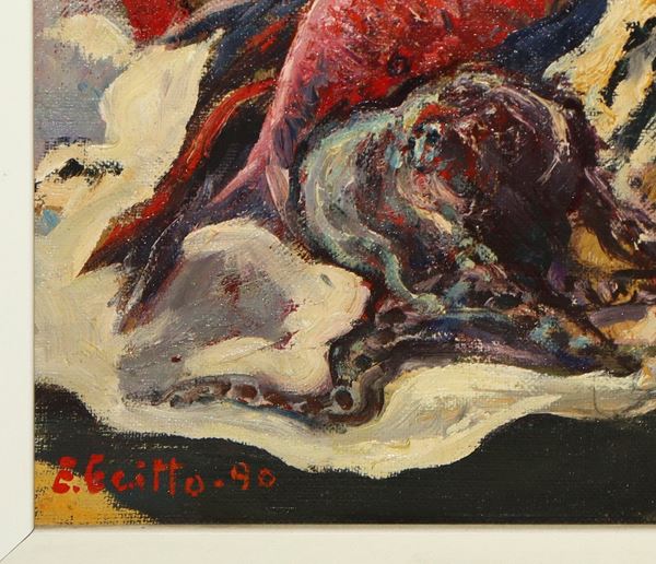Letting himself be inspired by the warm colors of the island, the uncultivated vegetation and the savory Mediterranean Sea, Eligio Egypt has given shape and soul to numerous pictorial works. His paintings are sagacious tributes to Sicily, of which he has captured every facet, from its inhabitants, rough like the earth warmed by the sun, to the juicy and sweet fruits typical of the island.