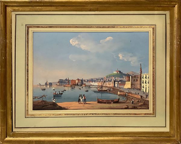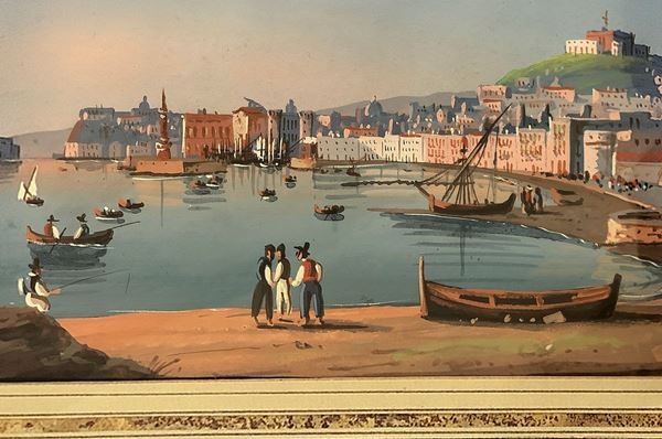 Painting depicting a gulf with boats and characters, End of the 19th century