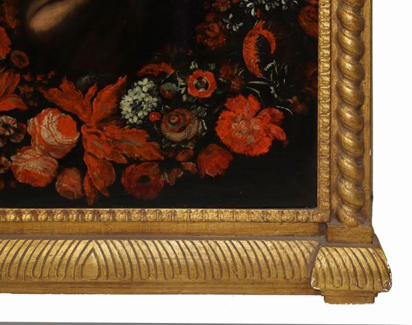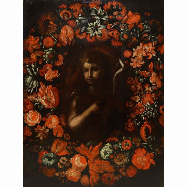 Portrait of a boy with a garland of red flowers., 17th century Flemish painter