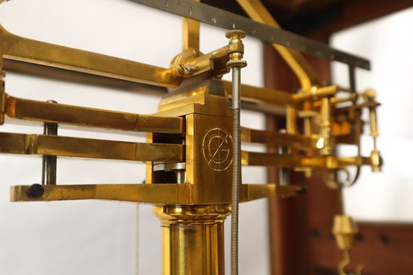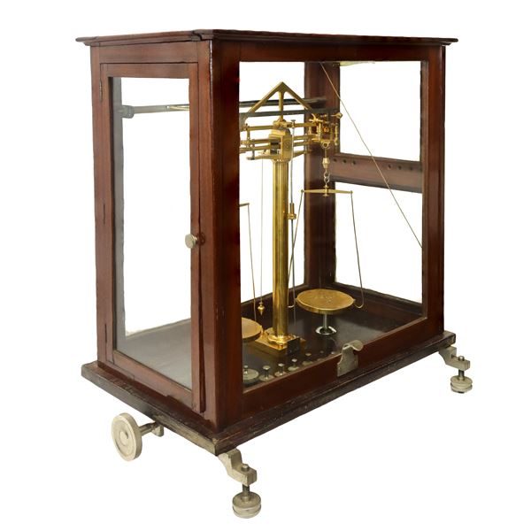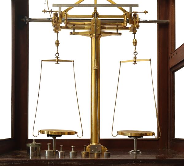 For laboratory or scientific uses. In brass. Inside wooden case with glass doors. Complete with weights