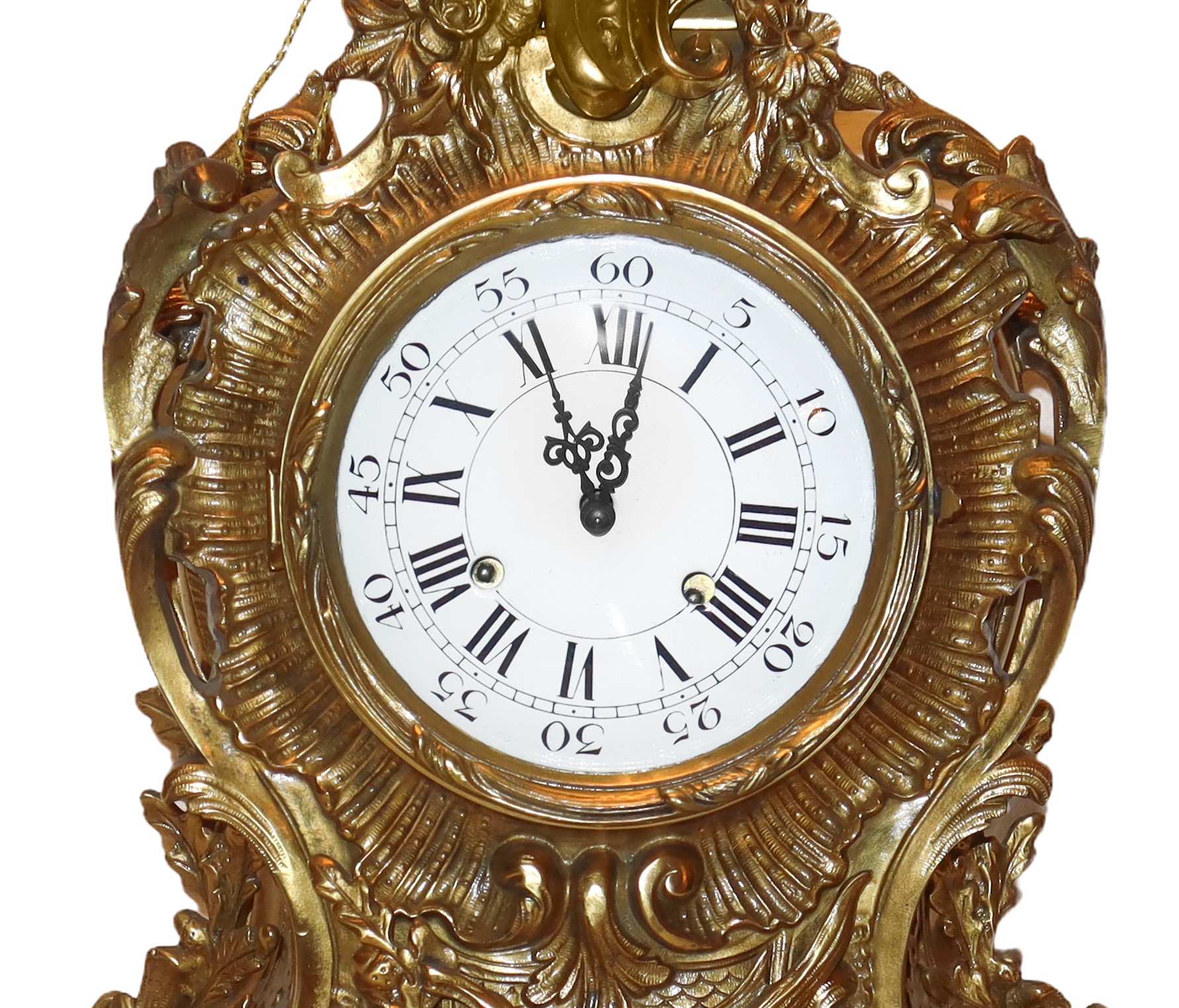 In gilt bronze, in the Louis XV style, white porcelain clock dial, Roman numerals, gilt bronze candelabra with hand-cut crystal bridles. Watch to be serviced.