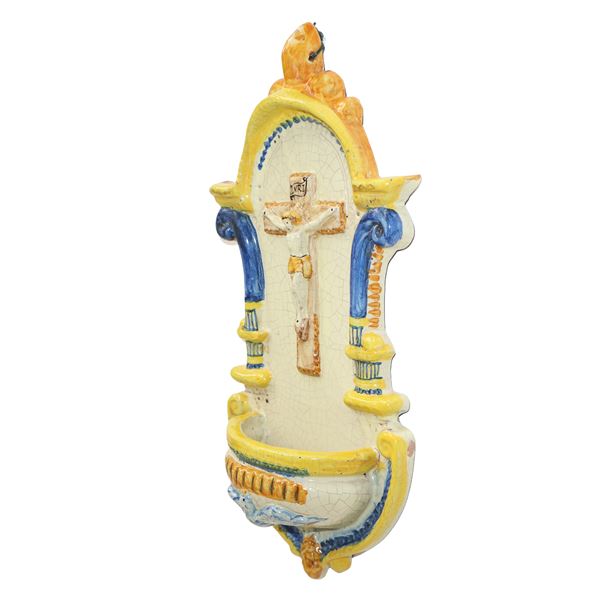 Holy water stoup in polychrome Caltagirone majolica, 20th century