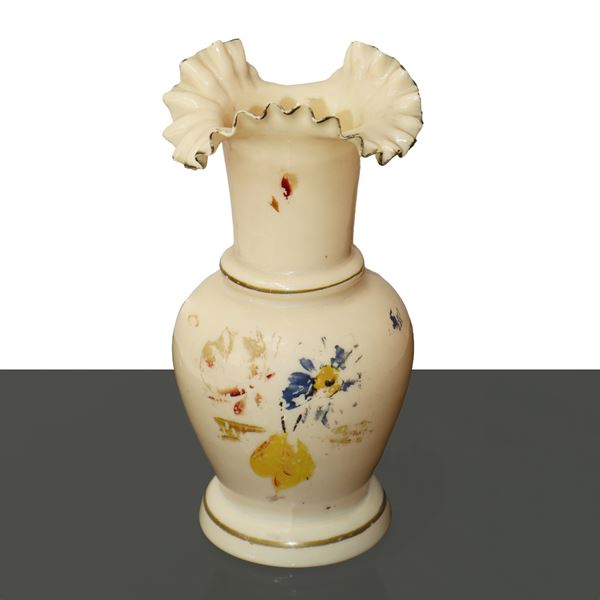Pair of opaline glass vases, beige, hand painted with polychrome flowers and pleated edge, nineteenth century