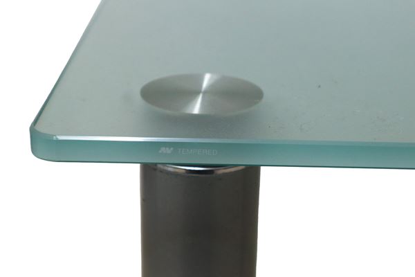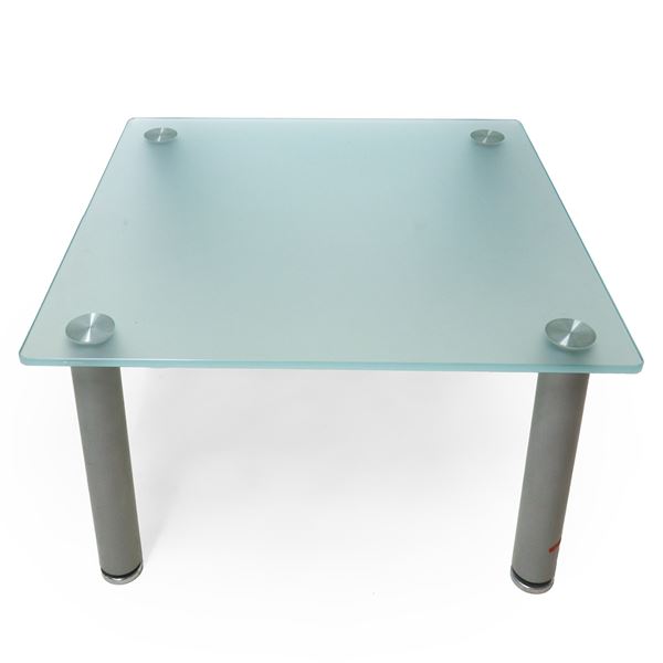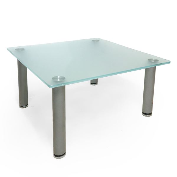 Low table produced. Italian with satin glass top and gray steel feet