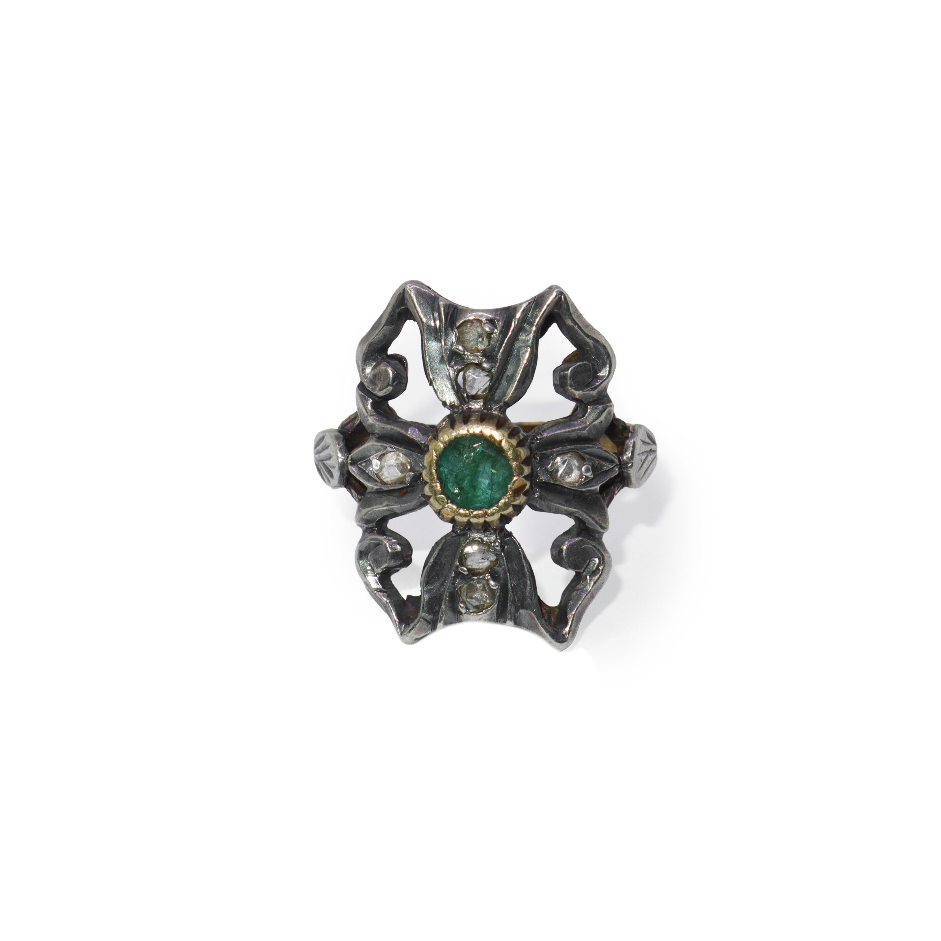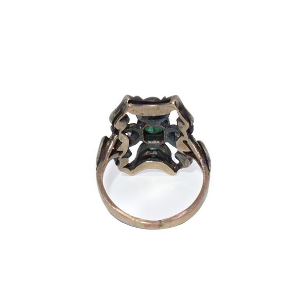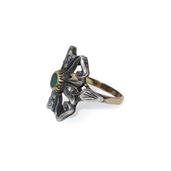 Antique style ring in gold and butterfly cupella with central round emerald and diamonds