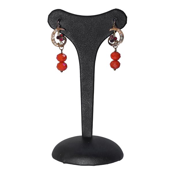 Crescent gold earrings with garnet beads and faceted coral pendants, Early 20th century