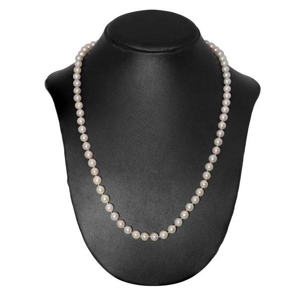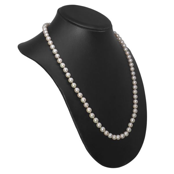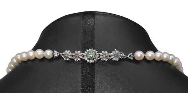 Cultured pearl necklace with white gold susta and five flowers with emerald flakes