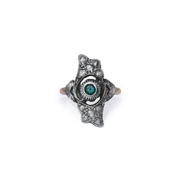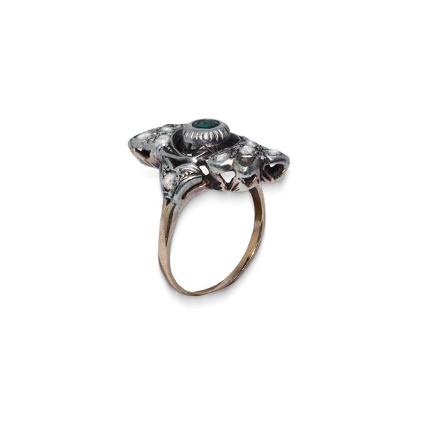 Gold ring and bow cupella with round emerald among diamonds