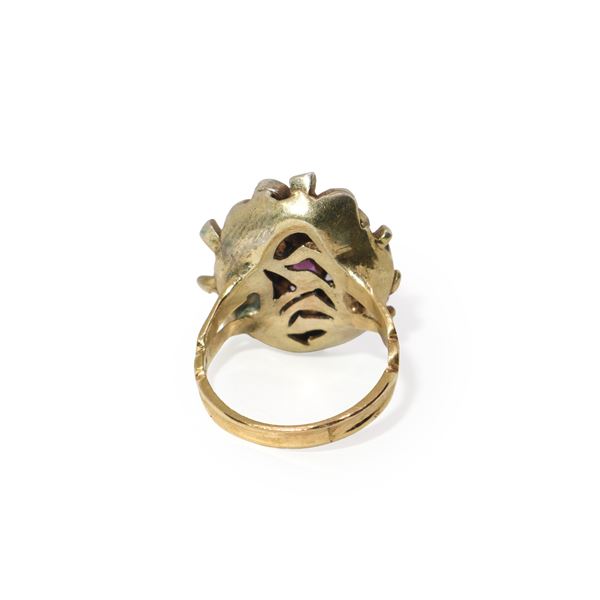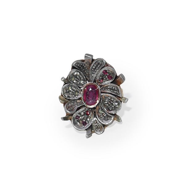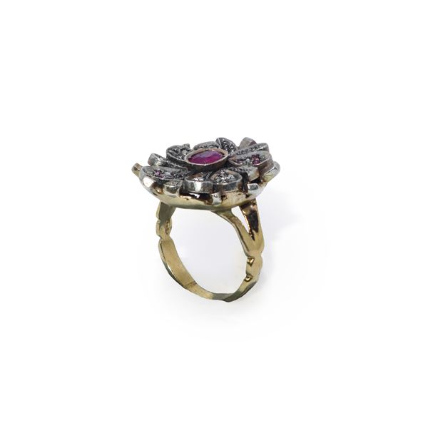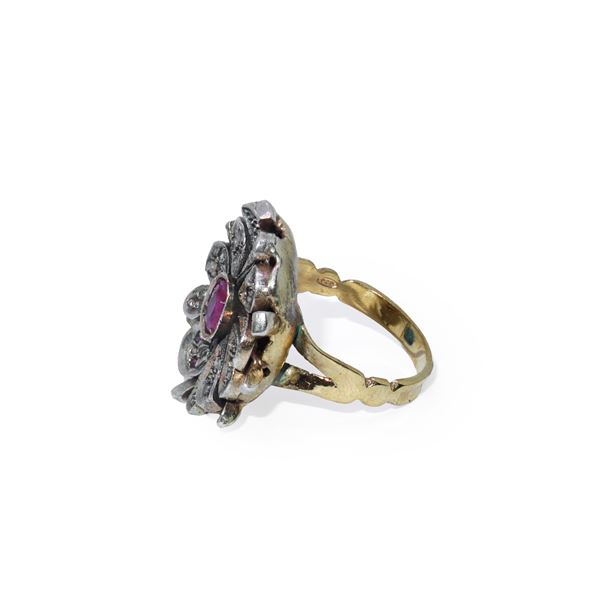Gold ring and convex cupella with central ruby surrounded by diamonds