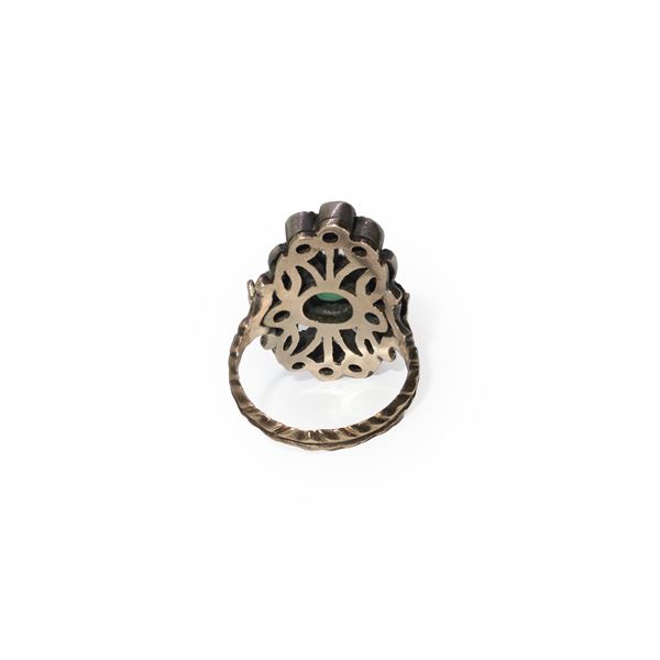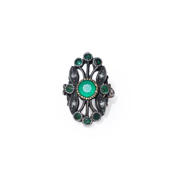 Gold ring and cupella with round emerald surrounded by emeralds, with chiselled shank, 40s