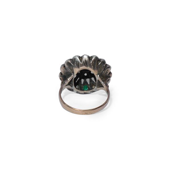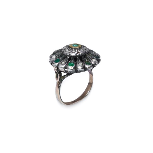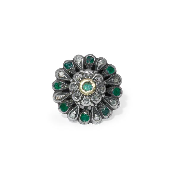 Patch ring with central emerald surrounded by interspersed emeralds and diamonds