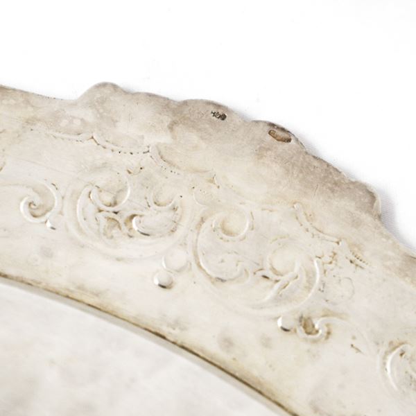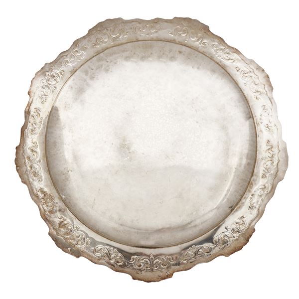 Round silver tray with engraved and embossed edge