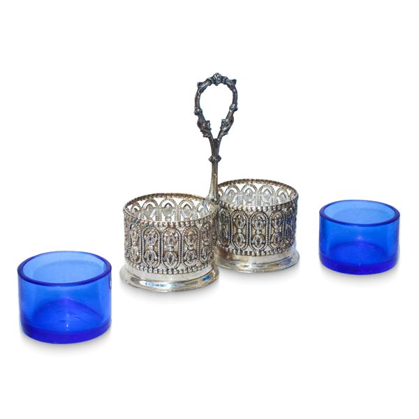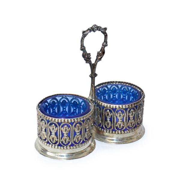 Salt and pepper shaker in blue Murano glass and 925 silver, 20th century