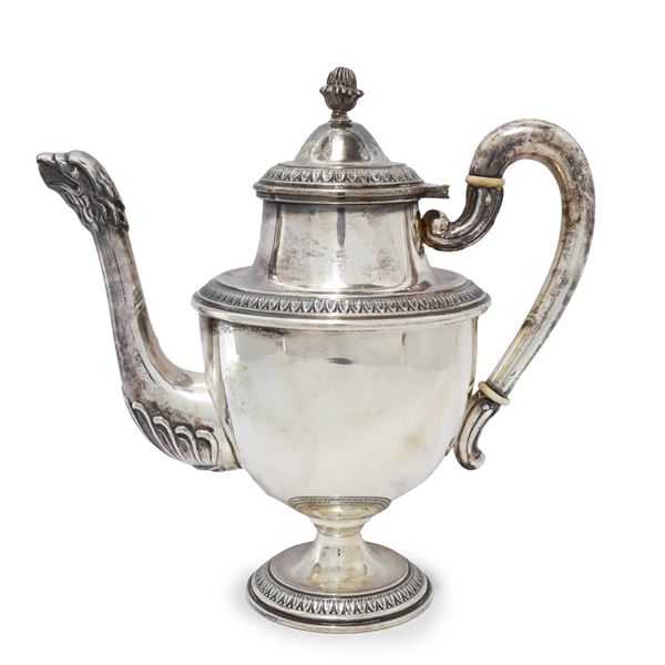 Consisting of teapot, milk jug and sugar bowl. Coffee pot H 24 cm 402 g, teapot H 19.5 cm 442 g, milk jug H 16 cm 171 g, sugar bowl H 12 cm 204 g