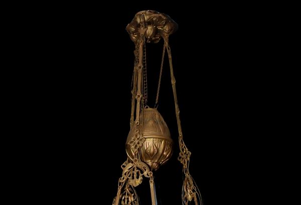 Electrified, liberty decorated majolica container, tulip glass diffuser, gilded bronze.
